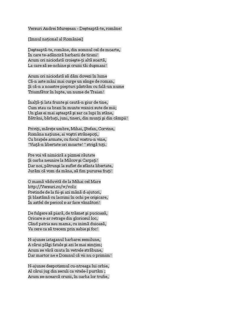 DeÈteaptÄ Te Romane Worksheet from files.liveworksheets.com Poezia răsunet (în manuscris unu răsunetu) a fost publicată în numărul 25 din 21 iunie 1848 al revistei. Unul dintre simbolurile cele mai importante ale fiecarei tari este imnul, iar data de 29 iulie a fost desemnata ca fiind ziua imnului national al romaniei, zi sarbatorita in fiecare an de catre romani. Acesta este format din strofele 1, 2, 4 și 11 din poemul „un răsunet, creația lui andrei mureșan. Adaugă această persoană în comunitatea ta și fii la curent cu activitatea sa din site. Vesurile sunt incluse in articol. Preotul profesor vasile oltean spune ca imnul romaniei nu a fost scris de anton pann, ci de brasoveanul gheorghe ucenescu. Cu această ocazie, instituţia prefectului a organizat un ceremonial militar şi religios, la care au. 15 din 25 ianuarie 1990, această prevedere fiind menţionată şi în constituţia româniei din 1991.